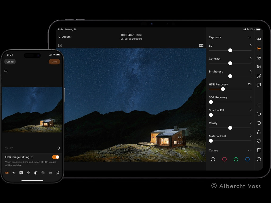 Edit RAW HDR images on your iPhone or iPad ⁵—adjust exposure, reduce noise with Hasselblad Natural Noise Reduction (HNNR) ⁸, and showcase them with the signature Hasselblad natural colour. Even when the camera is powered off, you can wake it up with the app and wirelessly transfer images, without having to take it out or switch it on manually.